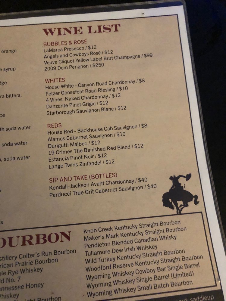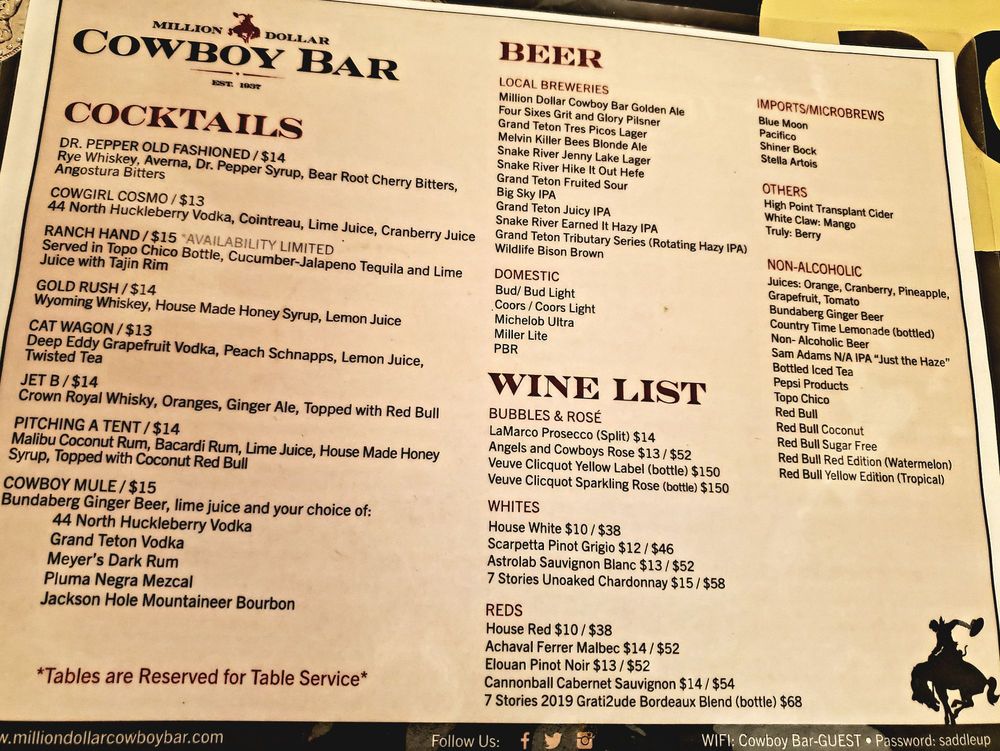 Introducing the menu at Million Dollar Cowboy Bar in Jackson, WY, where you can indulge in the Old West ambiance with saddle bar stools and a diverse selection of drinks. Customers rave about the signature Huckleberry Cowboy Mule and the unique cowboy-themed decor. From tasty cocktails like the Huckleberry Cosmo to classic brews, this bar has something for every drink lover. The live music, friendly service, and iconic saddle seating create an unforgettable experience for locals and tourists alike. Whether you're grabbing a quick drink or dancing the night away, Million Dollar Cowboy Bar offers a lively atmosphere with a touch of Western charm. So saddle up and enjoy a taste of Jackson's rich history at this must-visit spot.